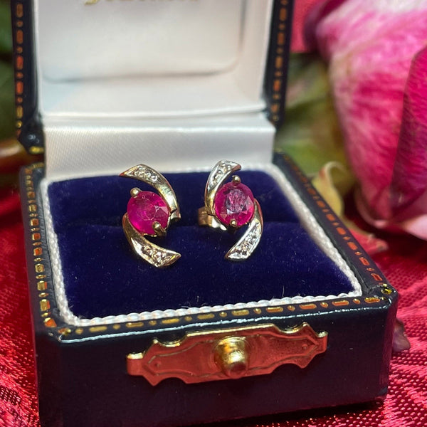 A beautiful pair of 9ct yellow gold stud earrings featuring lovely and bright rubies in the centre and encompassed by diamonds in a twist design.