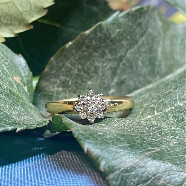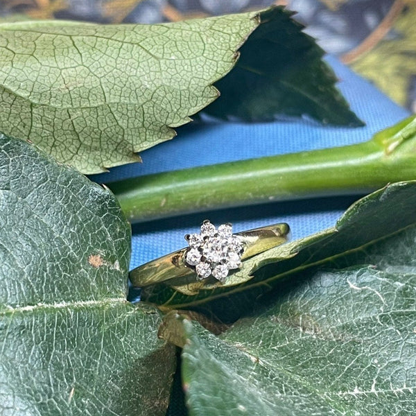 A beautiful 18ct yellow gold ring featuring a diamond cluster head.