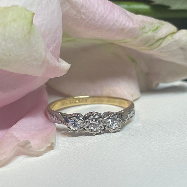 A beautiful 18ct yellow gold ring featuring 3 claw set diamonds.