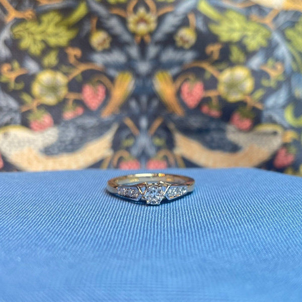 A gorgeous 18ct yellow gold ring with tapered shoulders and diamonds set in white gold.
