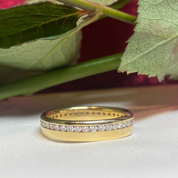 A gorgeous 18ct yellow gold eternity ring featuring round-cut channel-set diamonds all the way round.