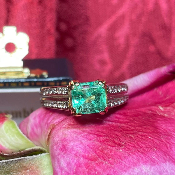 A gorgeous 18ct yellow gold ring featuring a beautiful emerald with diamond shoulders.