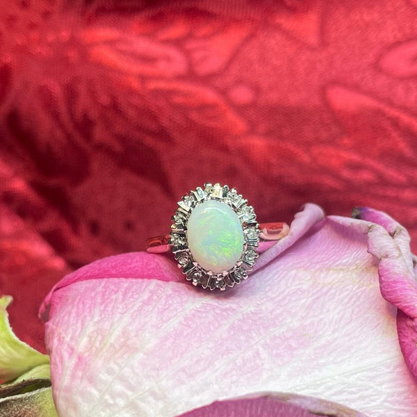 A gorgeous 18ct yellow gold ring with an opal in the centre, surrounded by a cluster of diamonds.