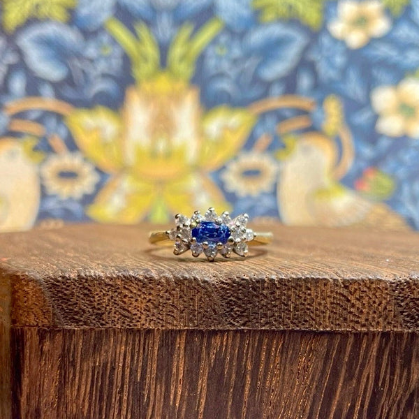 A gorgeous 18ct yellow gold ring with a central sapphire surrounded by a cluster of diamonds.