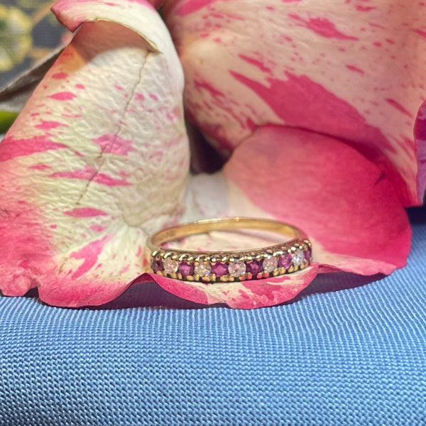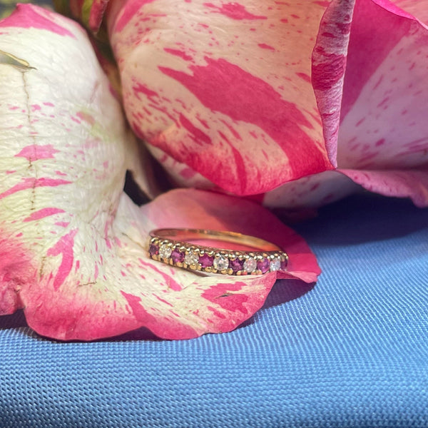 A beautiful 9ct yellow gold ring adorned with grain set rubies and diamonds.