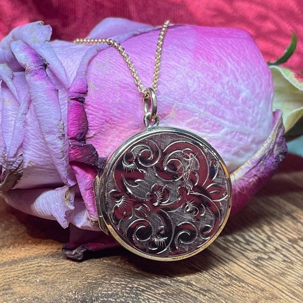 A beautiful 9ct yellow gold locket with floral detailing, suspended on a 9ct yellow gold chain.
