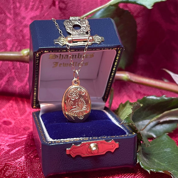 A lovely 9ct yellow gold locket on a 9ct yellow gold chain. The detailing on the locket comprises a flower and a butterfly.