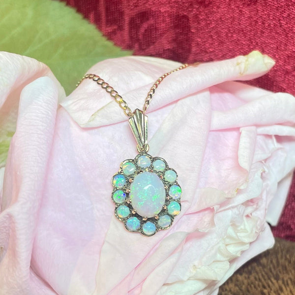 A gorgeous 9ct yellow gold necklace featuring a pendant comprised of a cluster of opals.