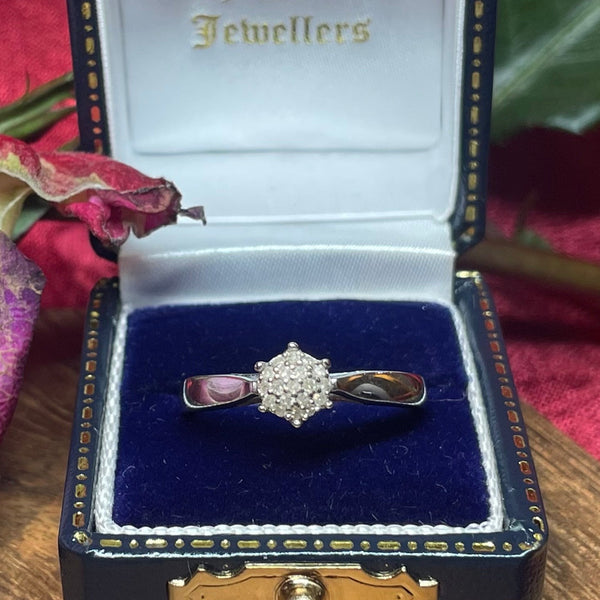 A beautiful 9ct white gold ring featuring a diamond cluster head.