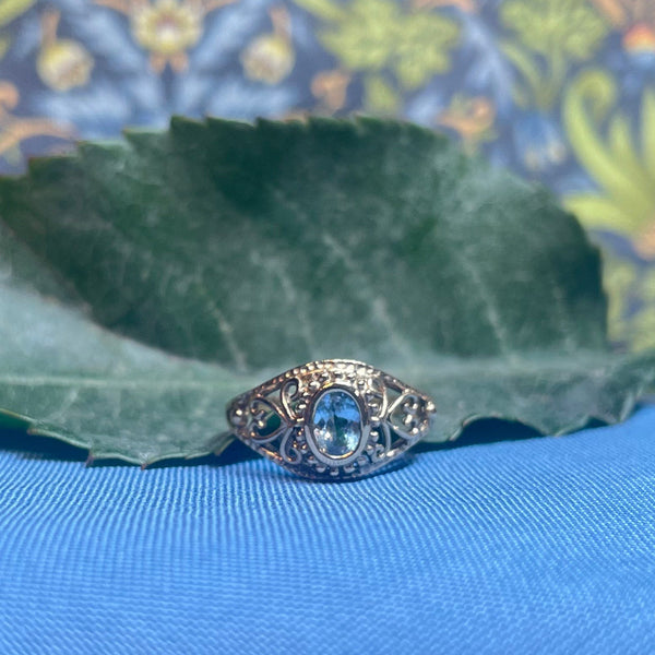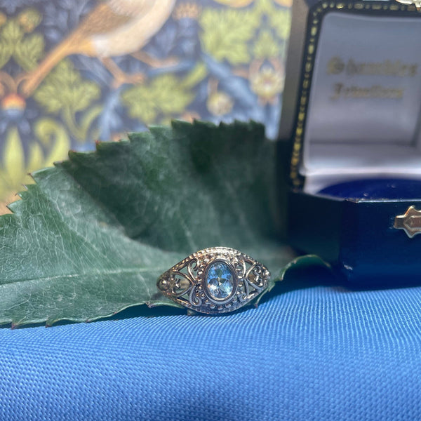 A beautiful 9ct yellow gold ring featuring a lovely blue topaz in the centre with ornate detailing.