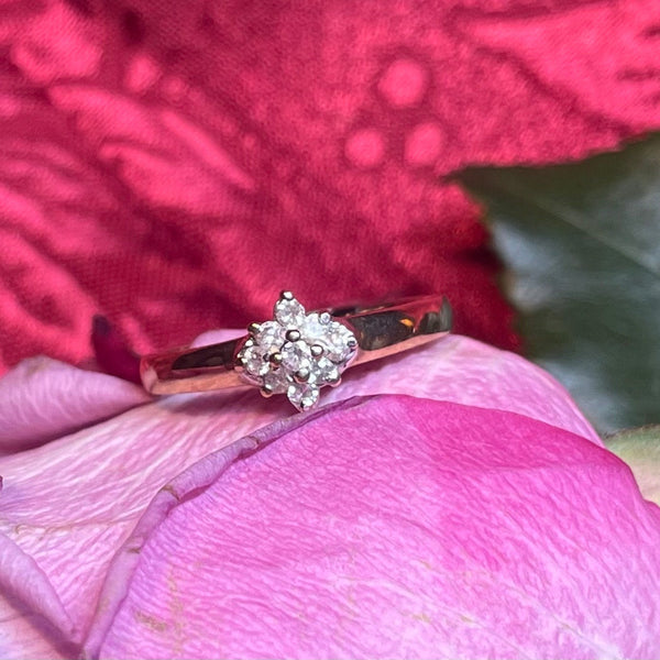 A sweet 9ct yellow gold ring featuring a small cluster of diamonds.