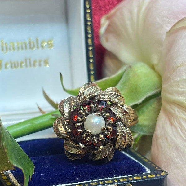 A gorgeous vintage ring made in 9ct yellow gold and adorned with a cluster of garnets surrounding a pearl.