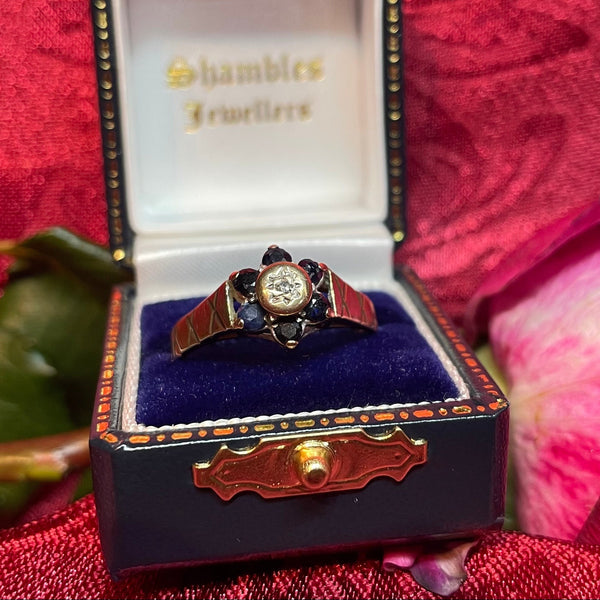 This exquisite 9ct yellow gold ring showcases a timeless flower design, featuring a stunning sapphire at its heart surrounded by sparkling diamonds. The vintage-inspired aesthetic combines classic elegance with refined craftsmanship, making it an ideal choice for those seeking a distinctive engagement ring or cherished heirloom piece. The warm glow of yellow gold complements the deep richness of the sapphire, whilst the diamond accents add brilliance and sophistication. A truly exceptional statement ring that transcends trends.