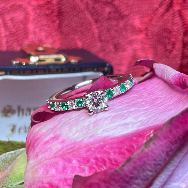 A gorgeous platinum ring with a centre claw-set ring with channel set diamonds and emeralds in the shoulders.