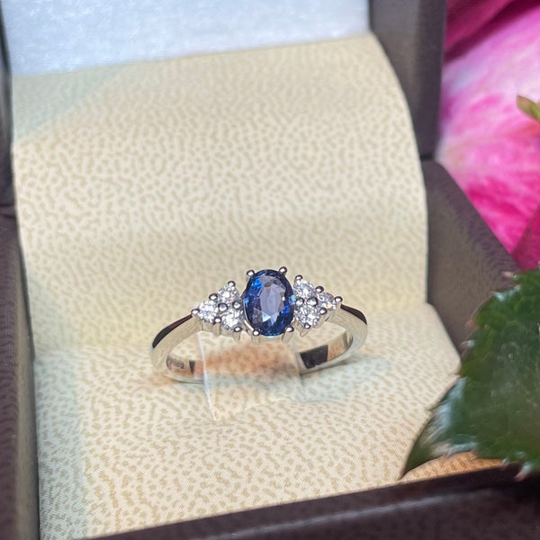 A gorgeous platinum ring with an oval sapphire in the centre and 3 claw set diamonds either side.